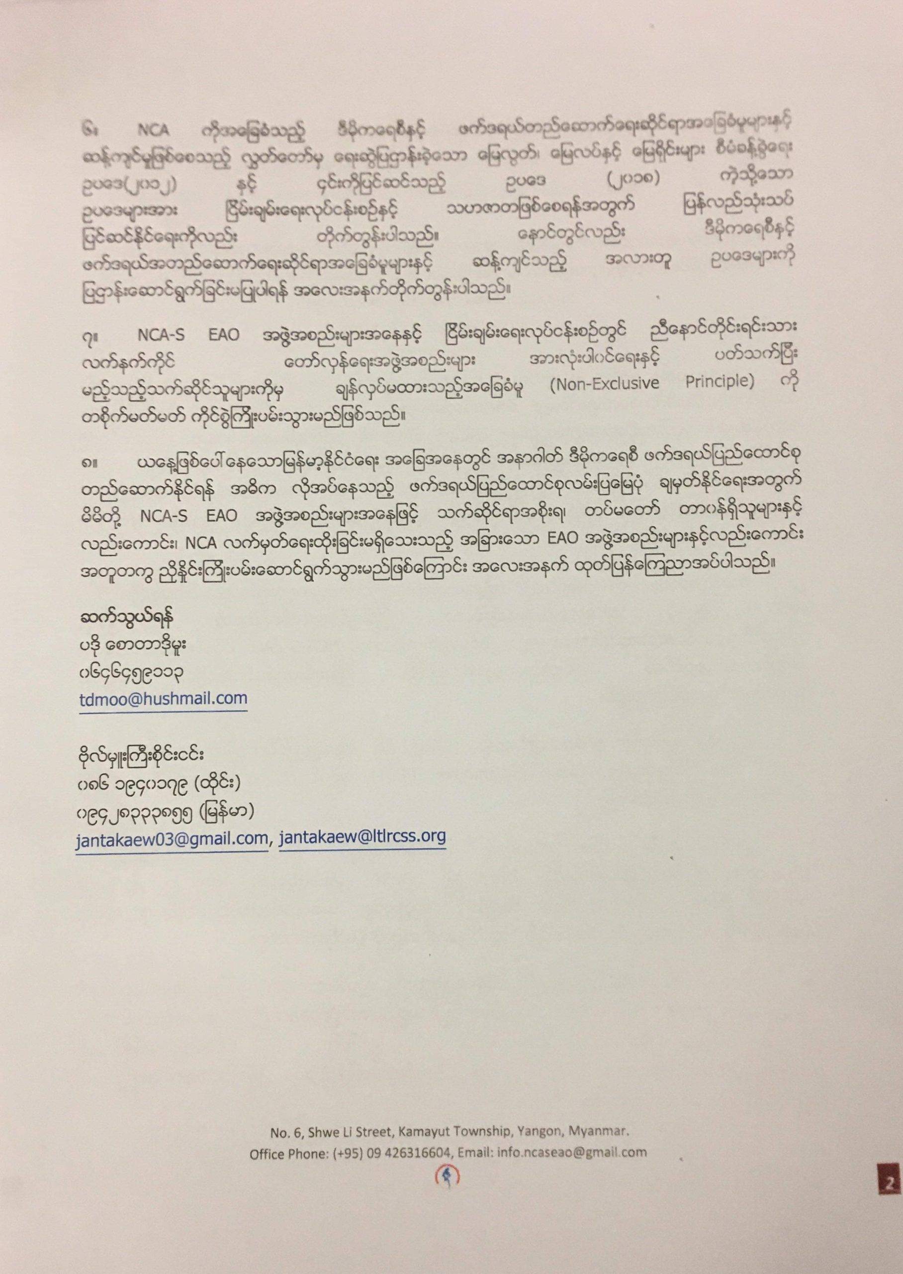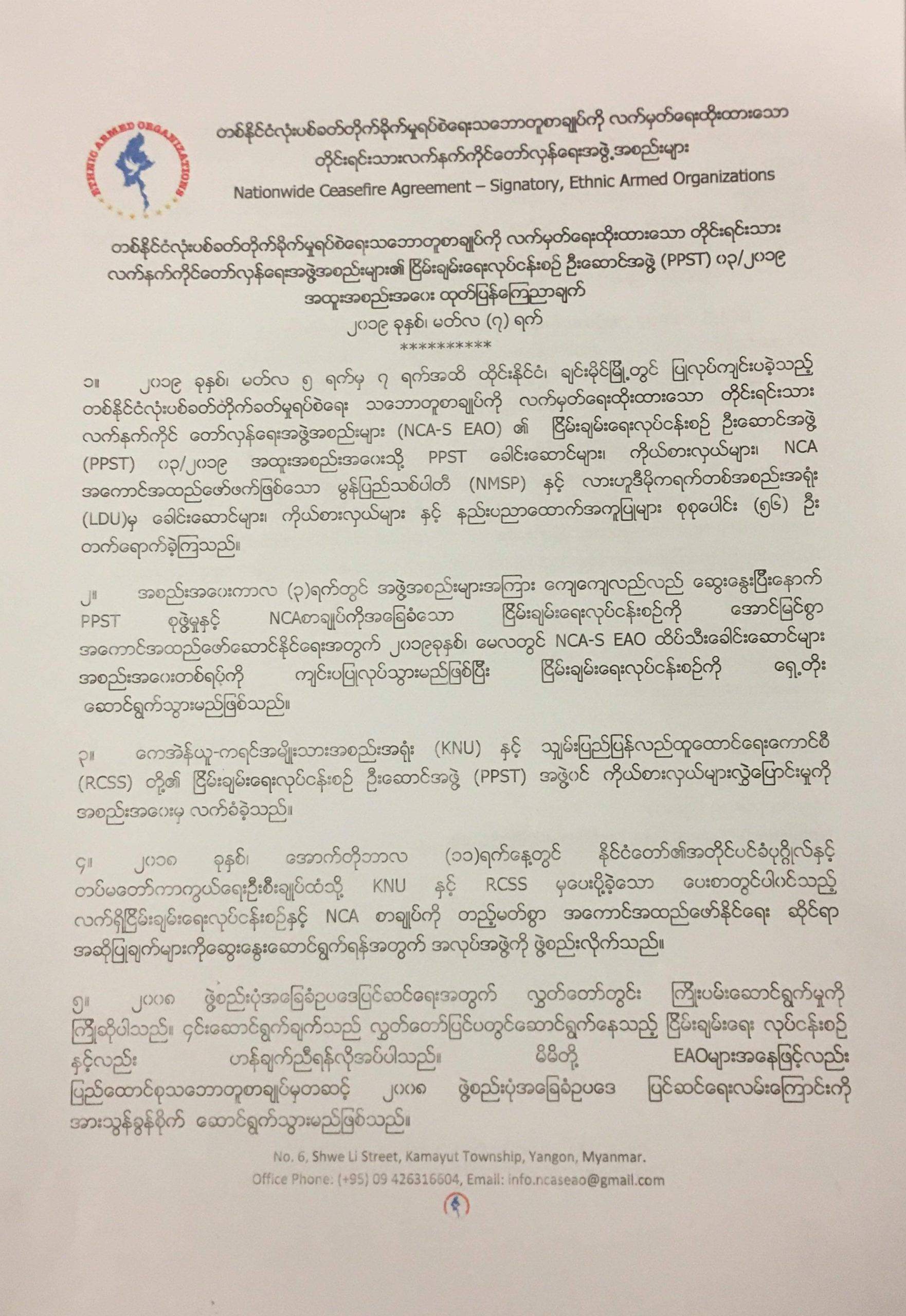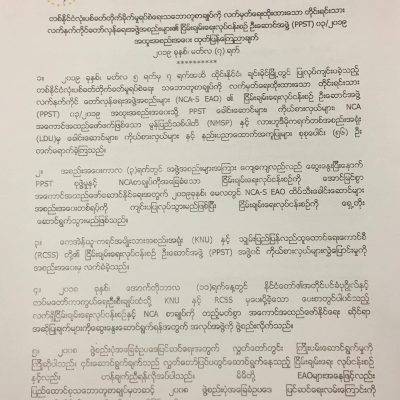 PPST အစည်းအဝေးအပြီး ထုတ်ပြန်ကြေငြာချက် (၂၀၁၉ ခုနှစ်၊ မတ်လ ၇ ရက် ) March 7, 2019 တစ်နိုင်ငံလုံး ပစ်ခတ်တိုက်ခိုက်မှု ရပ်စဲရေး သဘောတူစာချုပ်ကို လက်မှတ်ရေးထိုးထားသော တိုင်းရင်းသား လက်နက်ကိုင်တော်လှန်ရေး အဖွဲ့အစည်းများ၏ ငြိမ်းချမ်းရေး လုပ်ငန်းစဉ် ဦးဆောင်အဖွဲ့ PPST ၀၃/၂၀၁၉ အစည်းအဝေးထုတ်ပြန်ကြေငြာချက်။ ၂၀၁၉ ခုနှစ်၊ မတ်လ ၇ ရက်နေ့။