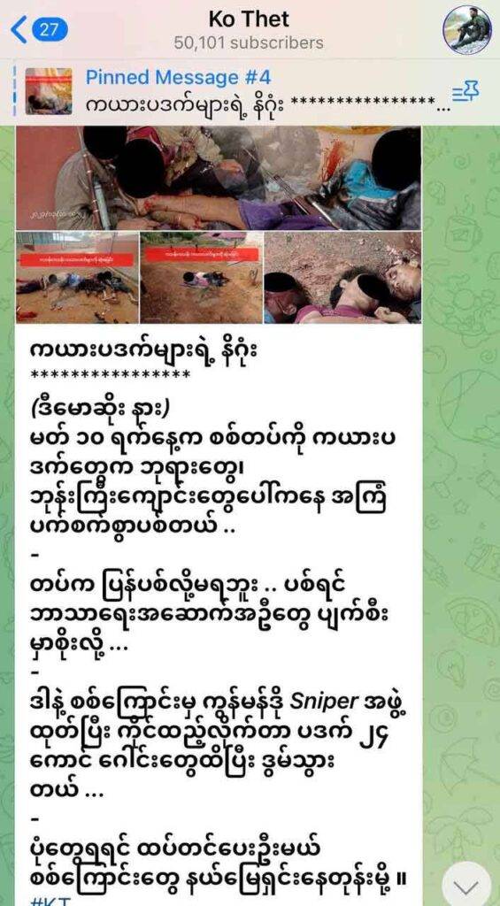 စစ်တပ်လော်ဘီများက “ဒီမောဆိုးနား၊ မတ် ၁၀ ရက်နေ့က စစ်တပ် ကို ကယားပဒက်တွေက ဘုရားတွေ၊ ဘုန်း ကြီးကျောင်းတွေ ပေါ်ကနေ အကြံပက်စက်စွာပစ်တယ် ..တပ်က ပြန်ပစ်လိုမရဘူး .. ပစ်ရင် ဘာသာရေး အ ဆောက်အဦတွေ ပျက်စီးမှာစိုးလို့ ဒါနဲ့ စစ်ကြောင်းမှ ကွန်မန်ဒို Sniper အဖွဲထုတ်ပြီး ကိုင်ထည့် လိုက်တာ ပဒက် ၂၄ ကောင် ဂေါင်းတွေထိပြီး ဒွမ်သွားတယ် ။ပုံတွေရရင် ထပ်တင်ပေးဦးမယ်။ စစ်ကြောင်းတွေ နယ်မြေ ရှင်းနေတုန်းမို့” ဟု ဝန်ခံ ရေးသားထားသည်။